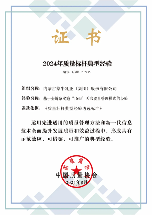 2024年8月15日,憑借多年在乳業(yè)全產(chǎn)業(yè)鏈質(zhì)量管理的深度實踐探索,蒙牛集團(tuán)提報的“基于全鏈條實施‘1643’天穹質(zhì)量管理模式的經(jīng)驗”就斬獲了由中國質(zhì)量協(xié)會發(fā)布的“2024年質(zhì)量標(biāo)桿典型經(jīng)驗”榮譽(yù)。